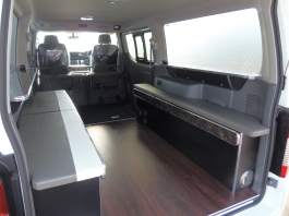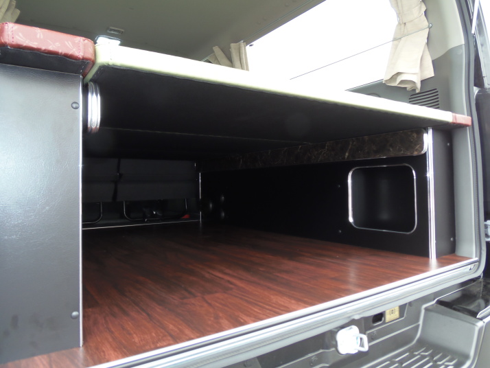 | ※画像は、NV350 CARAVAN Premium GX 2WD。ベッド下部高:425mm。 サブバッテリー、走行充電システム、室内LEDシーリングライトのオプション装着です。 |