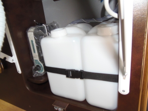 | トランスポーターとしても使えるVR470h Type-1の大きなカーゴスペースには、フロアに4カ所のタイダウンフック、天井端左右に移動式のフックを各5個づつ備えたガレージバーを設置。バイクや自転車の固定も容易にできます。右側キャビネット後部には、キャンピングカー構造要件に合致したシャワーフォーセット&フォールディングシンクと各10Lの給排水タンクを標準装備。給水タンク下部には、FFヒーター(オプション)設置スペースを確保しています。左側キャビネット後部には、小物入れを設置。電装システム(オプション)を選択した場合は、電装品の設置スペースとなります。 |