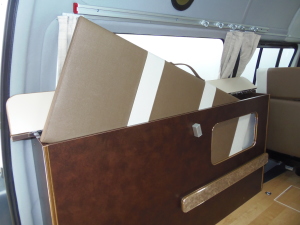 | ※掲載画像はVR470h Type-1リミテッドパッケージ装着車。5ドア。 ※室内色:ダークブラウン。フロア:木目調フロア。シート&バッドマット生地:ブラウン×ホワイト(防汚レザー) ※大型換気扇、リアスピーカー、リアクーラー、リアヒーター、5ドアはオプション装備。 ※2020モデル以降は、左側キャビネットにフォールディング式の調理台が装着されます。 |