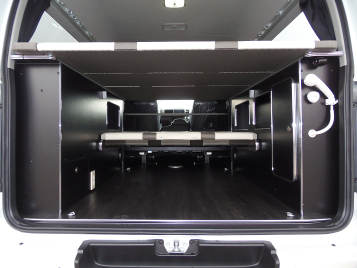 | トランスポーターとしても使えるVR480の大きなカーゴスペースには、フロアに4カ所のタイダウンフック、天井端左右に移動式のフックを各5個づつ備えたガレージバーを設置。バイクや自転車の固定も容易にできます。右側キャビネット後部には、アウトドアで手足についた砂や泥を流すのに便利なシャワーフォーセットと10Lの給排水タンクを標準装備。水タンク下部には、FFヒーター(オプション)設置スペースを確保しています。左側キャビネット後部には、小物入れを設置。電装システム(オプション)を選択した場合は、電装品の設置スペースとなります。 ★2022年4月以降は、全車8ナンバー登録の為、右側にフォールディング式シンクが装着となります。 |