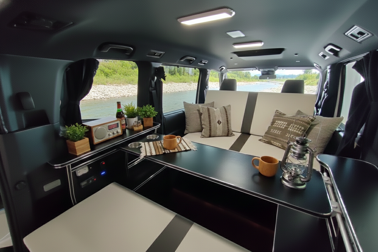 消費電力を抑えつつ、車内を隅々まで明るく照らす最新のLEDシステムを各所に配置。夜間のリビングモードでもストレスなく読書や調理が楽しめる明るさを確保しました。