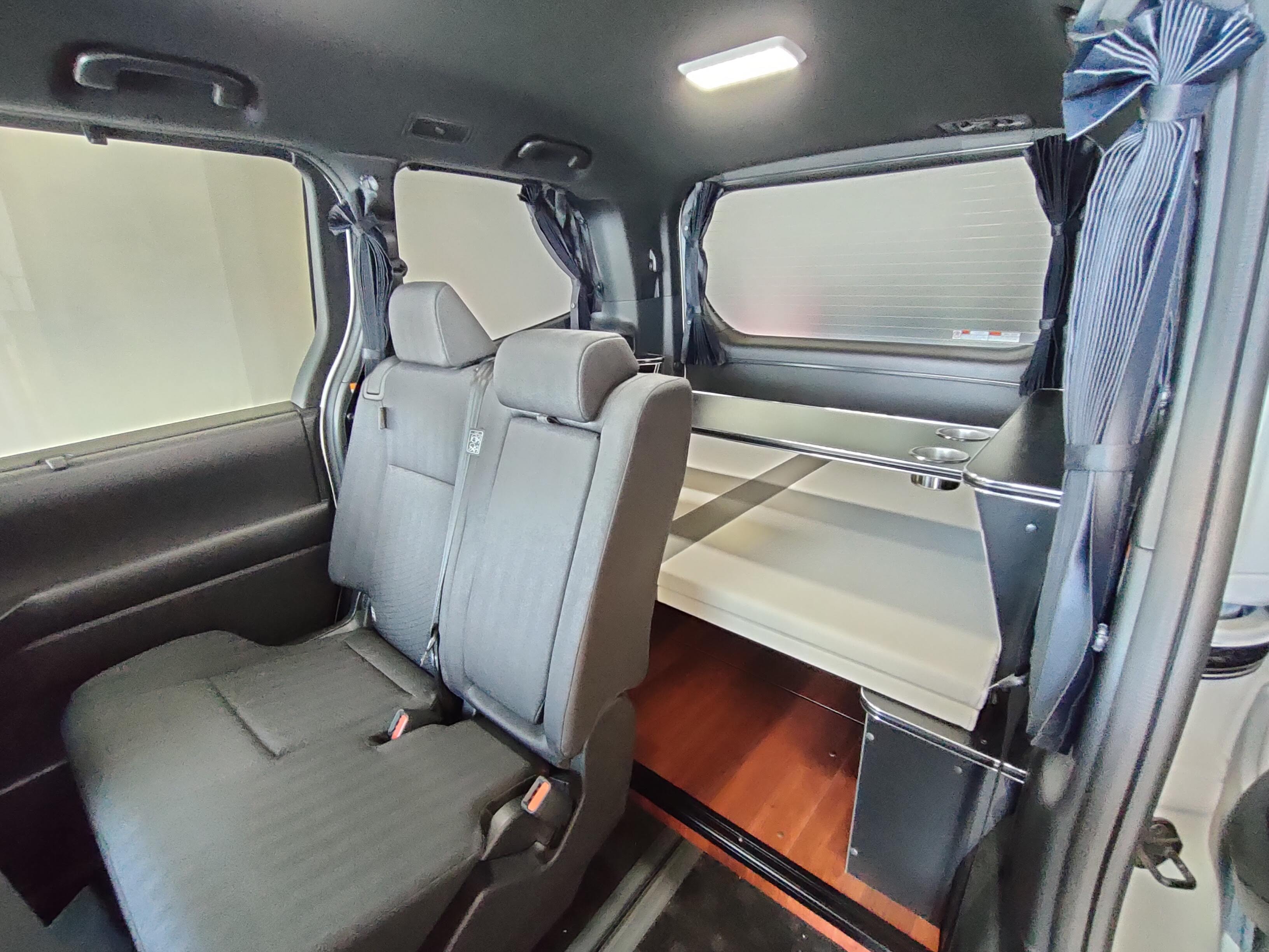 全ての窓にフィットする専用設計のトヨタ純正遮光カーテンを装備。外からの視線を完全にシャットアウトし、着替えや就寝時のプライバシーを徹底的に守ります。光漏れも防ぐため、夜間のサービスエリア等でも周囲に気兼ねなく過ごせます。