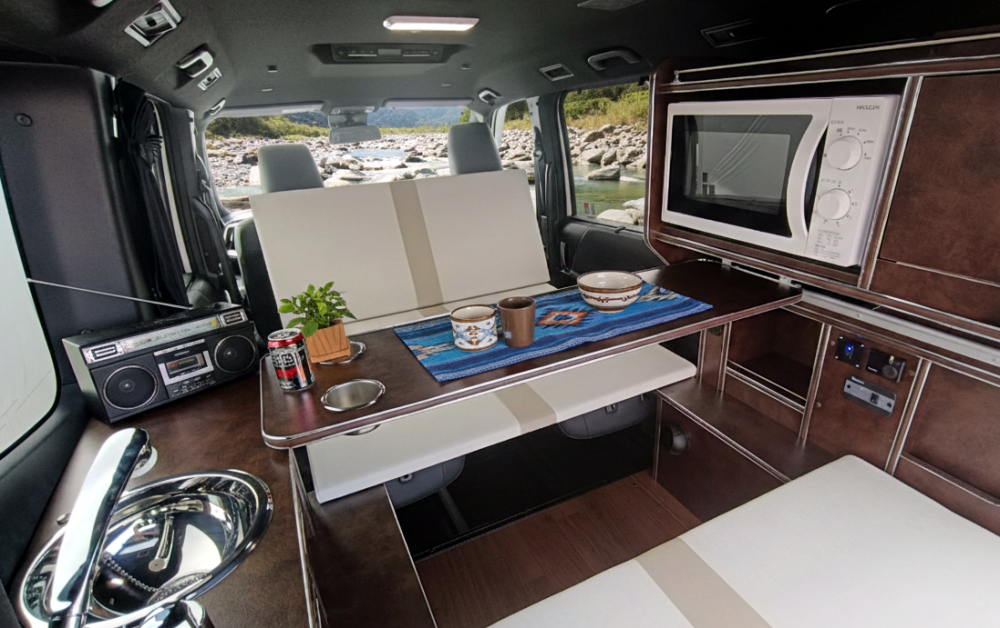 テーブルは、設置位置をバックドア側に移動して就寝時の小物置として使える他、