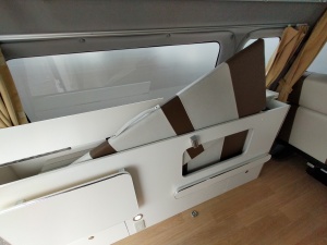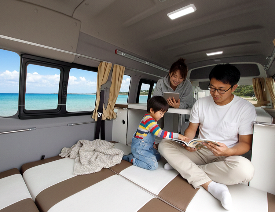 ※オプションでフラットクッションや、バタフライタイプシートへ変更可能です。 ・セカンド左右席3点式シートベルト&中央席2点式シートベルト ・上段用ベッドマット(大4枚、小2枚) ・下段用ベッドマット兼用ベンチ(2枚)