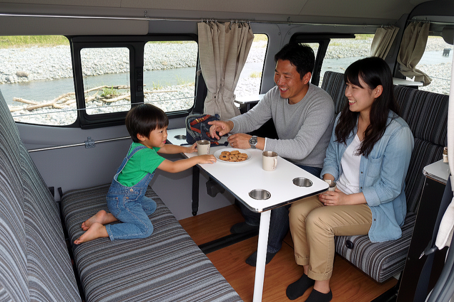 5ドア車は1本脚。4ドア車は、右側壁面へテーブルサポートを設置し右側へオフセット設置することにより左スライドドアからサードベンチへのアクセス性を高め、4ドア車のみセカンドシート前向きでのテーブル使用ができるように設計しています。