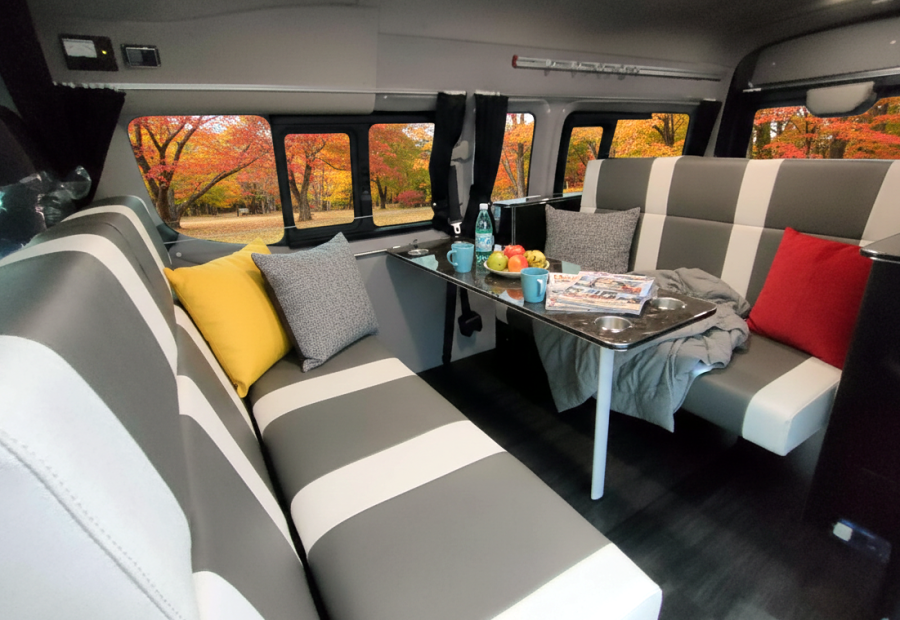 | バンレボリューションシリーズ最大の魅力でもある収納式2段ベッドで、最大5名の就寝スペースを生み出すことができます。上段は790mmと余裕のクリアランスに1,800mm×1,720mmサイズのベッドになり、下段は2,400mm×1,400mmサイズのフルフラットなベッド展開ができます。上段下段ベッドとも、クリアランスが充分にあり成人男性が天井面に体をぶつけることなく寝返りを打てる空間があります。またフロアから上段ベッド下部までの高さは790mmを確保し、バックゲートから下段ベッド後端までは840mmの空間を取ることができますので、多少背の高い荷物がある時でも2段ベッドの展開が可能です。 |